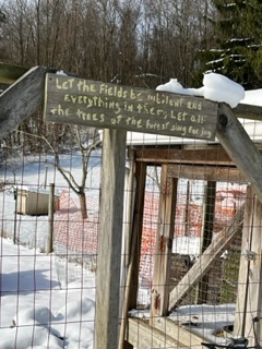 This a hand-painted sign we have hanging on the gate to our garden. It comes from a verse in Psalm 96 expressing that all of nature will sing to the Lord praises when He comes to judge the world in righteousness and the people in faithfulness.